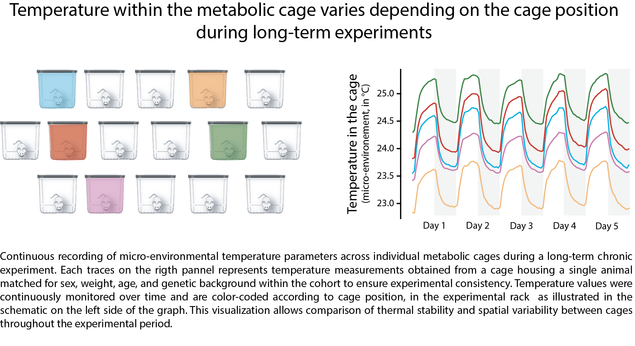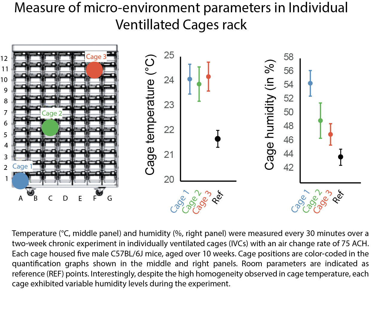 16.12.2025 – 6min Micro-Environmental Humidity and Temperature in Rodent Metabolic Researchby Pierre-Louis Ruffault, PhDCage-level humidity and temperature in rodent metabolic research play a critical yet often underestimated role in shaping thermogenesis, energy expenditure, and metabolic outcomes. While ambient temperature is widely recognized as a key driver of metabolic rate in mice, increasing evidence shows that humidity and cage micro-environmental variability can substantially influence energy balance, obesity phenotypes, and experimental reproducibility.Environmental parameters measured at the room level often fail to reflect what animals actually experience inside the cage. As a result, unrecognized micro-environmental differences may introduce variability that confounds metabolic and physiological readouts in preclinical studies.Temperature, Thermoneutrality, and Chronic Cold Stress in MiceAmbient temperature is a well-established determinant of rodent metabolism and obesity [1]. In mice, temperatures below thermoneutrality activate sustained thermogenic responses to maintain core body temperature, leading to increased whole-body energy expenditure [2], [3].Standard laboratory housing temperatures (approximately 20–24 °C) therefore impose chronic cold stress. This condition elevates daily energy expenditure and alters not only metabolic but also immune outcomes compared with thermoneutral housing [4], [5]. Quantitative studies examining how small temperature shifts affect the ratio of daily energy expenditure to basal metabolic rate highlight the importance of carefully selecting and reporting housing temperatures in metabolic research [6].Cold exposure further enhances sympathetic activation of brown adipose tissue (BAT) and thermogenic pathways, resulting in substantially higher resting and total energy turnover relative to thermoneutral conditions [3], [7].Why Ambient Humidity Matters for Energy BalanceBeyond temperature, ambient humidity is emerging as another critical environmental cue influencing metabolic regulation. Mice possess sensory mechanisms capable of detecting changes in relative humidity (RH), triggering rapid physiological responses as well as longer-term adaptations that affect susceptibility to metabolic alterations.Despite this, humidity often remains insufficiently regulated in laboratory vivariums. Variability in RH between facilities, or even within the same room, may therefore contribute to inconsistent metabolic outcomes across studies. Importantly, controlling temperature and humidity at the room level does not guarantee stable conditions at the cage level, where animals reside.Cage-Level Micro-Environments and Hidden VariabilitySignificant heterogeneity in cage micro-environment temperature and humidity exists even under standardized housing conditions. Variations in RH and temperature within mouse cages frequently correlate with cage position within the rack, driven by differences in airflow, vertical temperature gradients, cage design, bedding materials, nesting behavior, and animal phenotype.As a result, cages housed within the same room and rack may expose animals to markedly different micro-environmental conditions. These findings underscore a critical point: cage micro-environments are not equivalent, even when facility-level parameters appear tightly controlled.In many laboratory settings, ventilation introduces air from the ceiling, creating a top-down airflow. Cages in the upper tiers are closer to air supply vents, resulting in increased air flow and lower RH due to enhanced moisture removal. Lower-tier cages often receive less airflow, trapping more humidity generated by respiration and bedding. Thermal gradients also play a role: warm air rises, making upper-tier cages warmer. Warmer air holds more moisture, which can decrease RH even when absolute humidity is constant. Empirical studies support these observations. Higher room ventilation rates (5 → 20 air changes per hour) reduce intra-cage humidity from 55% to ~36% RH, with the strongest effects in top-row cages [8], [9]. Even IVC systems – often viewed as a gold standard – show meaningful RH fluctuations despite >75 cage air changes per hour [10]. Importantly, these variations persist even when factors such as animal strain, cage temperature and feeding patterns are controlled. Moreover, even when apparent sources of variability such as cage temperature, animal genetic background, sex, and feeding behavior are controlled or appear homogeneous, notable differences in cage-level humidity still emerge. These observations underscore the importance of systematically considering microenvironmental humidity as a potential confounding factor when designing experiments and interpreting physiological or behavioral outcomes in rodents. Figure 1 below shows an example: RH measured inside cages varies systematically by cage level despite identical room conditions. Variations in temperature and RH can affect both animal welfare and experimental outcomes. Low RH induces a short-term increase in caloric intake (first 1–2 days), likely reflecting greater evaporative heat and water loss. High RH alters insulation and adipose tissue deposition [11]. Elevated humidity in lower-tier cages can promote ammonia accumulation [12], [13], causing respiratory irritation and welfare concerns, which then influence metabolic and behavioral data. Therefore, inconsistent environmental conditions across cages can introduce significant variability. Why Measuring Temperature and Humidity at Cage Level Is Essential.Room-level environmental monitoring does not capture the conditions animals actually experience. Measuring cage-level humidity and temperature allows researchers to:• Detect micro-environmental gradients that alter thermogenic demand • Reveal hidden sources of variability in metabolic phenotypes • Identify cages with elevated ammonia accumulation and welfare risks • Align environmental con